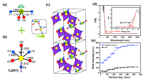 非线性光学晶体是一类可实现倍频、和频、差频、光差量放大和多光子吸收等非线性过程的重要光电功能晶体,在激光变频、光学通讯、深空探测、军事技术等领域具有重要应用。高性能的二阶非线性光学材料在具有强非线性光学性能的同时,还需要满足透光范围宽、带隙大、激光损伤阈值高等性能要求。目前,复合两种或两种以上具有二阶姜-泰勒畸变的阳离子(例如d0过渡金属阳离子和具有立体化学活性孤对的阳离子)可以使晶态材料获得强的倍频响应。然而由于d0过渡金属的存在,此类材料往往表现出相对较窄的光学带隙,进而限制了材料的光学透过范围,难以满足二阶非线性光学晶体的实际应用要求。