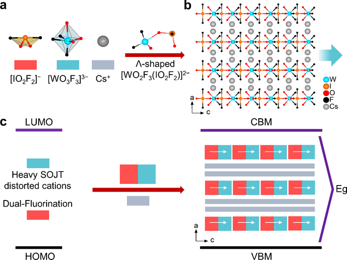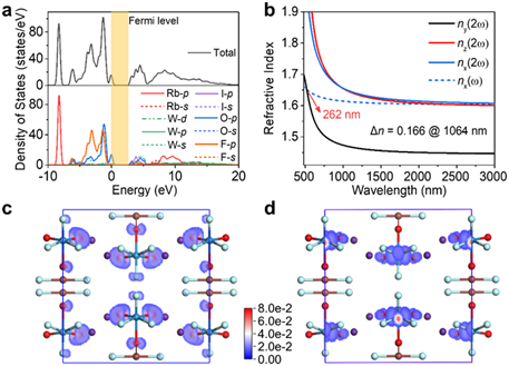 在这一研究中,研究团队对具有孤对电子的I5+和具有较低有效电负性的W6+两种二阶姜-泰勒畸变的重阳离子进行双氟化,在能带结构中引起了显著差异,从而有效地增强了材料线性及二阶非线性光学性能。同时,氟元素作为化学“剪刀”,诱导两种氟代氧阴离子基元共享氧位点,形成Λ构型的零维结构单元[WO2F3(IO2F2)]2−。这些构造单元沿c轴堆积,有利于基团二阶微观极化率的叠加。研究团队还运用单晶结构X射线衍射分析结合密度泛函理论方法进行模拟计算,进一步探讨并阐明了RWOFI和CWOFI中带隙和倍频效应的增益可归因于[WO3F3]2−和[IO2F2]−两种氧氟阴离子的有效排列。该氟化碘酸盐在1064 nm下表现出强的倍频效应(3.8 × KDP (RWOFI)和3.5 × KDP (CWOFI)),并且能够实现相位匹配。该氟化碘酸盐还具有覆盖紫外到中红外波段的宽光学透过窗口和宽的光学带隙(4.42 eV (RWOFI)和4.28 eV (CWOFI),带隙为d0过渡金属碘酸盐体系中最大值)。该项研究中提出的双氟化导向能带工程策略为高性能二阶非线性光学材料的开发提供了新的思路。