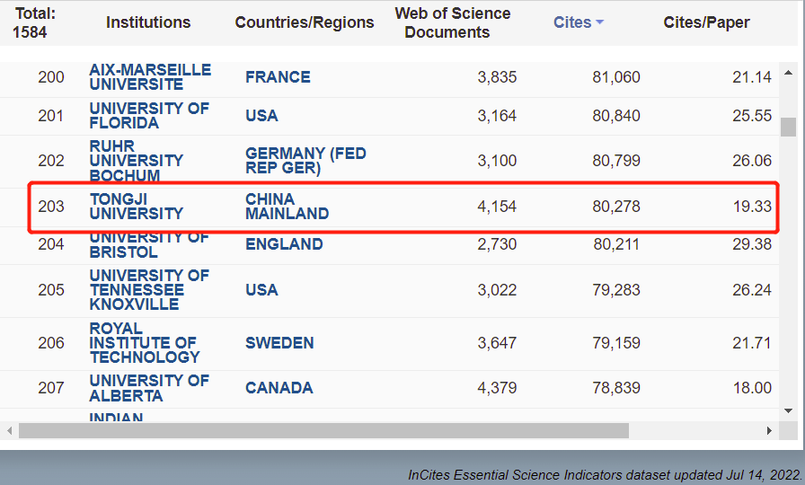 2022年7月最新ESI国际排名发布,同济化学学科排名第203位