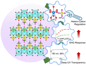 与上述π-共轭深紫外二阶非线性光学晶体相比,非π-共轭基元构筑的深紫外二阶非线性光学晶体可表现出更短的紫外吸收截止边,然而已报道的绝大多数非π-共轭深紫外二阶非线性光学晶体存在着二阶非线性光学效应弱等不足。针对这一科学难题,张弛院士研究团队以非π-共轭硫酸盐为研究对象,提出了一种复合阳离子盐策略,构建了一例具有强倍频效应的稀土基硫酸盐深紫外二阶非线性光学晶态材料。相关成果“A Lanthanum Ammonium Sulfate Double Salt with a Strong SHG Response and Wide Deep-UV Transparency”(一种具有强倍频响应和宽的深紫外透过的硫酸镧铵复盐)日前以通讯的形式在线发表于《德国应用化学》(Angew. Chem. Int. Ed., 2021, DOI:10.1002/anie.202115855)上,并被Angewandte Chemie编辑委员会遴选为Hot Paper。这已是张弛研究团队今年第七次连续在国际化学顶级期刊上发表系列重要研究成果。