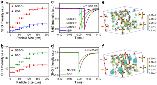 在这项研究中,研究团队基于硼酸盐溶液化学合成方法,以深紫外二阶非线性光学晶体NaSr3Be3O9F4 (NSBBOF)为结构模型,采用共价键调制策略,在材料中实现四面体基元[BO4]和[BeO3F]的同位点取代,最终获得去铍的硼酸盐晶态材料。高浓度的硼酸盐溶液有利于[BO3]/[BO4]基团聚合成高核的B-O簇,进一步形成具有三维结构的共价框架,这种三维结构可赋予材料大的光学带隙,使材料实现更高的紫外透过率。基于这一共价键调制策略,研究团队成功设计合成了一例由[B9O19]簇组成的无铍羟基硼酸盐。实验研究显示,该晶体NSBOH具有良好的物化稳定性,其紫外吸收截止边小于190 nm,与理论紫外吸收截止边178 nm相吻合。NSBOH在可见光和紫外光波段内同时具有强的倍频响应(3.3 × KH2PO4 @ 1064 nm,0.55 × β-BaB2O4 @ 532 nm),为深紫外硼酸盐晶态材料的最大值,是一例性能优异的深紫外二阶非线性光学晶体材料。该项研究对于在羟基硼酸盐体系中探索设计性能优异的深紫外二阶非线性光学晶体具有重要的前瞻示范意义。