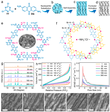 碳材料具有化学性质稳定、原料丰富、导电性高、环境友好等优点,已广泛应用于超级电容器和锌离子混合电容器等储能器件。通过碳电极-电解质界面电荷的快速可逆吸脱附,碳基超级电容器可在几秒甚至几微秒内实现能量存储和释放,其理论工作寿命可达上百万次充放电循环。在碳骨架中引入电化学活性位点可以增加电极赝电容,但通常面临着电化学反应动力学迟缓和碳骨架坚固性差的困境,引发电极活性急剧衰减和循环稳定性不足等问题。因此,如何设计兼具高能量密度、快速电荷存储动力学和长循环寿命的碳基超级电容器颇具挑战。在这一研究中,研究团队提出了一种基于“质子盐”型多孔有机聚合物框架设计碳超结构材料的策略,利用−NH2+Cl−−基团嫁接电子属性互补的三聚氯氰(电子受体)和2, 6-二氨基蒽醌(电子给体)有机分子形成“质子盐”型多孔有机刚性框架,通过分子内氢键和π−π平面堆叠生长机制促使有机骨架自组装形成纳米颗粒嵌入的层状碳超结构材料。