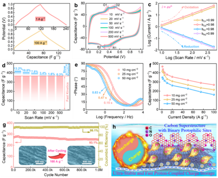 研究表明,设计的碳超结构材料可以有效降低结构中化学缺陷处的离子结合能垒,促进电极表面质子耦合电荷存储,因而赋予构筑的超级电容器高倍率长循环寿命(100 A g−1超大电流密度下,一百万次循环后容量保持率为93.1%)和高能量密度(114 Wh kg−1)。这项工作为通过结构工程和表面化学设计改善碳材料电荷存储行为提供了新的见解。