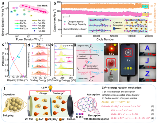 此外,Zn2+被广泛认为是锌离子混合超级电容器储能过程中碳阴极的活性离子,但质子(H+)是否具有活性仍然未知。电化学和异位能谱表征阐明了H+和Zn2+协同储能机理,主要涉及可逆的H+吸附/解吸反应和Zn2+转变两个过程。所组装的锌离子器件获得了128 Wh kg−1的高能量密度和二十万次的循环寿命。