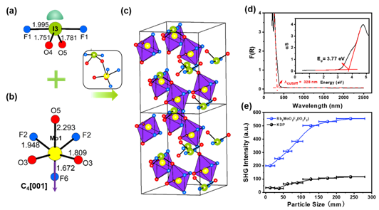 张弛院士研究团队近期还在过渡金属氟碘酸盐二阶非线性光学晶体的研制方面取得了进展。他们通过一种两步氟化策略,向氟碘酸盐体系中引入氟化过渡金属中心多面体来增加结构畸变和宏观极化,构建了第一例碱金属氟化钼氧氟碘酸盐A2MoO2F3(IO2F2) (A = Rb (RMOFI), Cs (CMOFI)),该材料表现出强的倍频效应(5 × KDP和4.5 × KDP),其中RMOFI晶体的倍频强度在氟碘酸盐体系中是最大的。同时,由于强电负性氟离子的多位取代,使得晶态材料表现出增强的光学带隙(3.77 eV和3.43 eV)。相关成果近期发表于Chemistry of Materials, 2021, 33(14), 5700-5708,这一研究表明,将氟化d0过渡金属八面体引入氟碘酸盐体系是开发新型高性能非线性光学材料的一种有效方法。