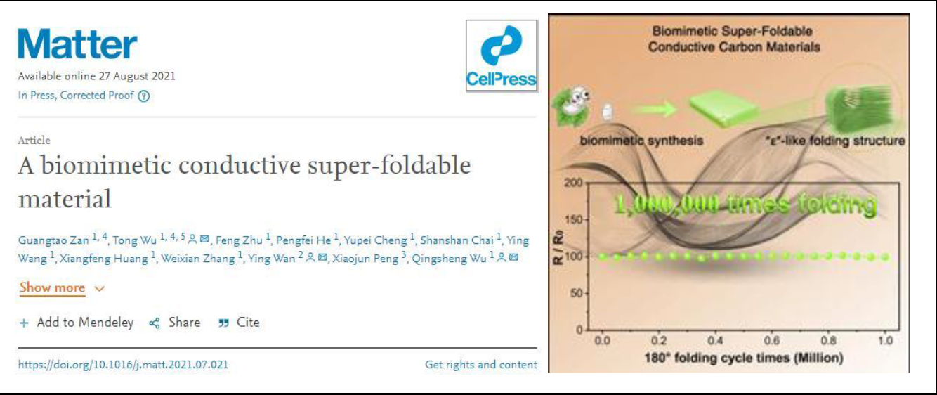 鉴于此,公司1946伟德国际源自英国吴庆生教授和吴彤特聘研究员领衔的研究团队在通过化学键理论创建本征导电材料不可折原理基础上,应用超材料设计思想和仿生设计思路,使用改进的静电纺丝/梯度碳化技术,首次仿生制备了一种可惊人地承受100万次乃至无限次真折叠而无任何损伤的超折叠导电碳材料(SFCMs),这实际上是一种导电柔性超材料(meta-material)的问世。通过自建的实时SEM折叠系统观察研究以及力学模拟分析,揭示了SFCMs折叠过程中的多级应力分散机制,为其它超折叠材料和器件的设计制造指明了方向,具有重大的科学意义和广阔的应用前景。相关工作以“A biomimetic conductive super-foldable material”为题发表在Cell姊妹刊《Matter》上:Matter, 2021, DOI:10.1016/j.matt.2021.07.021。