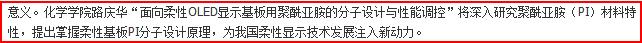 公司特聘教授、国家杰出青年科学基金获得者路庆华教授申报的项目“面向柔性OLED显示基板用聚酰亚胺的分子设计与性能调控”获准立项,这是公司近年来获得的第二项国家自然科学基金委重点项目。路庆华教授的项目将深入研究聚酰亚胺(PI)材料特性,提出掌握柔性基板PI分子设计原理,为我国柔性显示技术发展注入新动力。