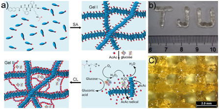 水凝胶是一类以水为分散介质的软物质材料,因其类似于生物组织的富水多孔的特征,广泛应用于组织工程等生物医学领域。3D生物打印领域的重要问题就是设计出满足多重生物打印需求的水凝胶体系。当前的商业打印凝胶包括天然多糖、丝素蛋白和多肽等,都不能很好的兼顾快速打印成型和凝胶高强度这两大需求。 日前,化学系功能纳米复合凝胶课题组开发出酶引发聚合温和制备高强度超分子-高分子复合水凝胶的新途径。该体系将打印成型和凝胶强化两个步骤分开,有望得到高强度的可打印凝胶体系:首先多肽凝胶因子在水中通过氢键和π-π堆积等亲疏水作用自组装形成弱的第一重凝胶网络,作为易于挤出成型的凝胶材料;然后负载在第一重凝胶中的酶催化聚合体系和高分子单体能够在室温下缓慢生成高分子链,对前述的凝胶网络的骨架进行交联强化(图a);最后得到的复合水凝胶在保持超分子胶的生物相容性、自修复和可降解性的同时,机械强度得到极大程度的提高以适应组织工程材料的需求。