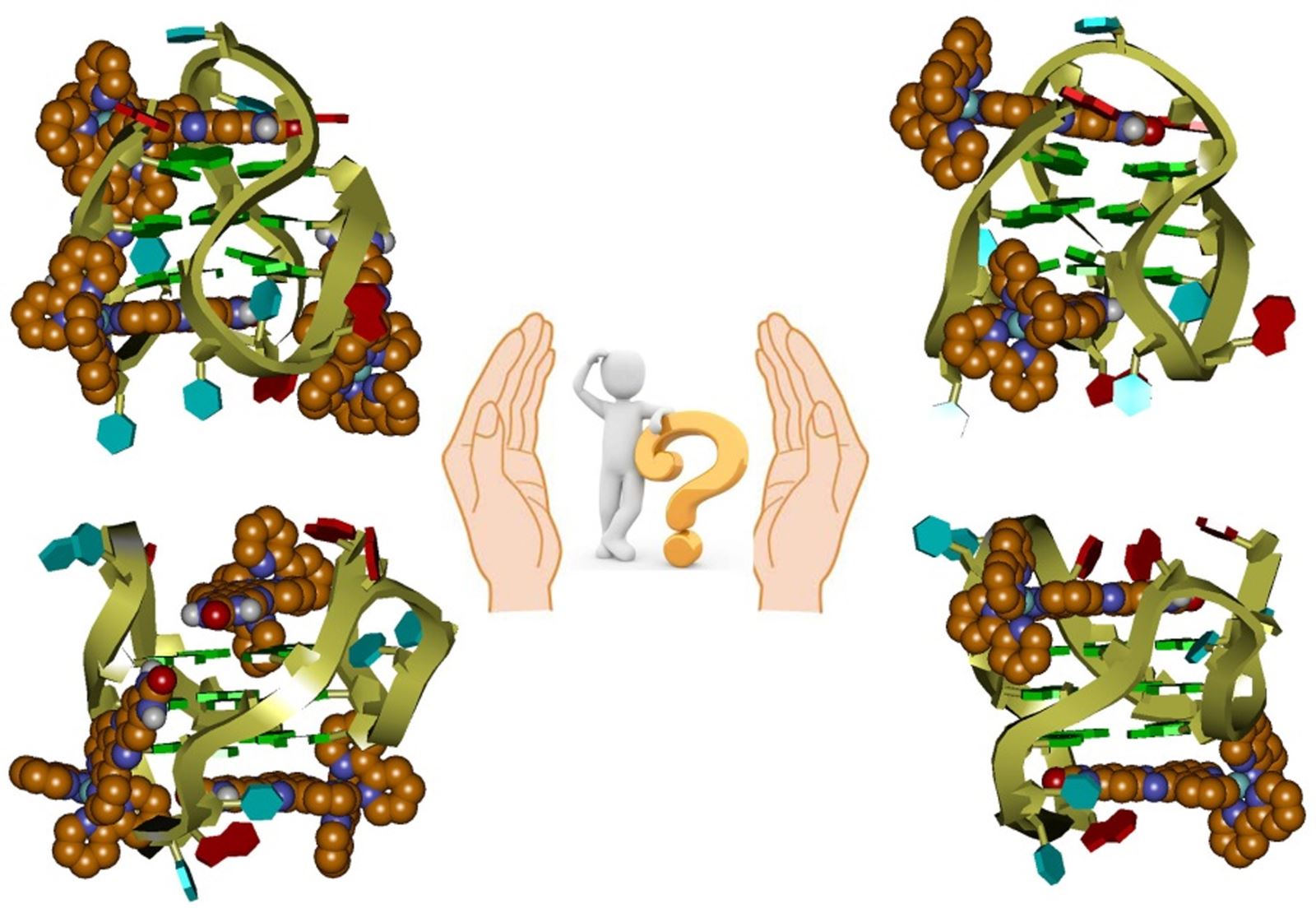 DNA构象的多态性与许多病变密切相关,其中最著名的是恶性肿瘤。G-四链体结构是一种特殊的DNA二级结构,能形成G-四链体的DNA序列广泛的存在于染色体的许多重要区域,如端粒和癌基因启动子区。石硕等通过金属配合物的配体设计,实现了G-四链体DNA的荧光开关控制((Chem. Eur. J. 2015, 21, 13390 – 13400. (IF = 5.731));利用手性配合物实现了对平行、反平行和混合型四链体DNA的立体选择性识别 ((Chem. Eur. J. 2015, 21, 11435 – 11445.(IF = 5.731));并通过理论计算解释了相关结果 ((Dalton Trans., 2015, 44, 19264–19274.(IF= 4.197))。
