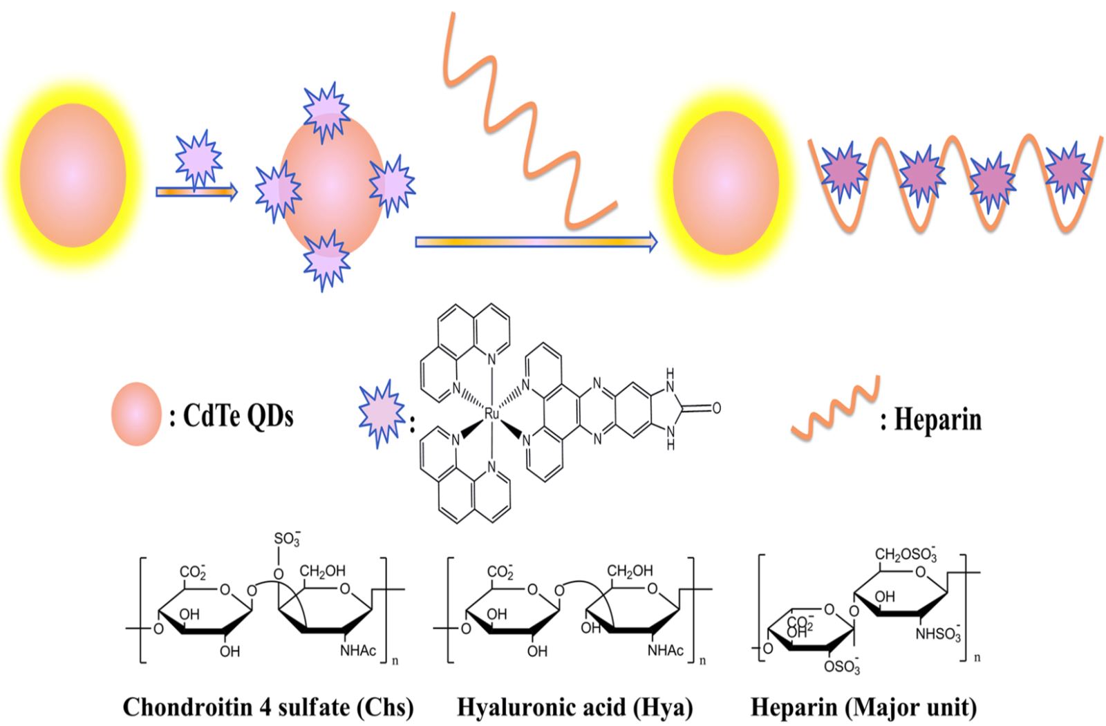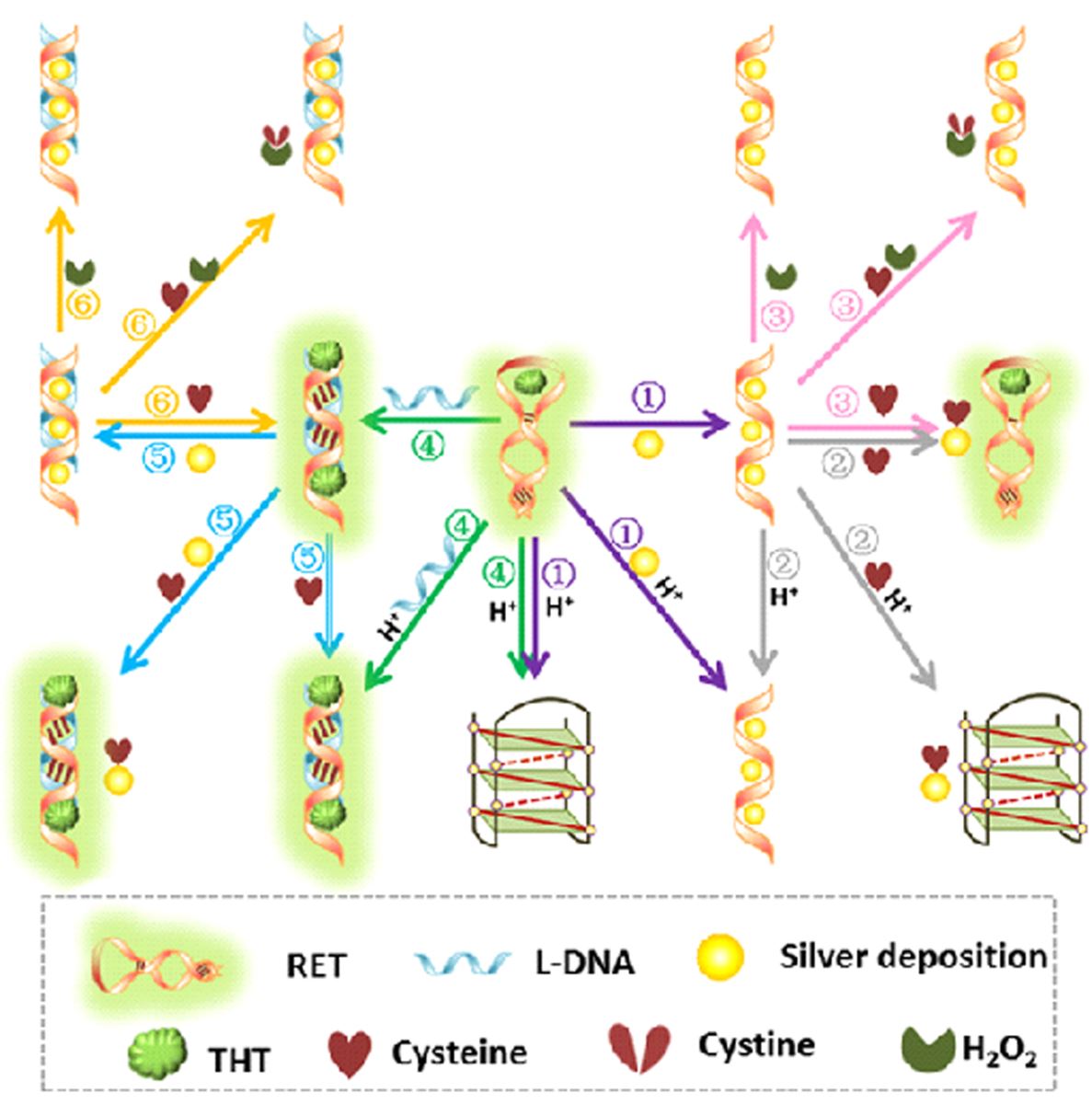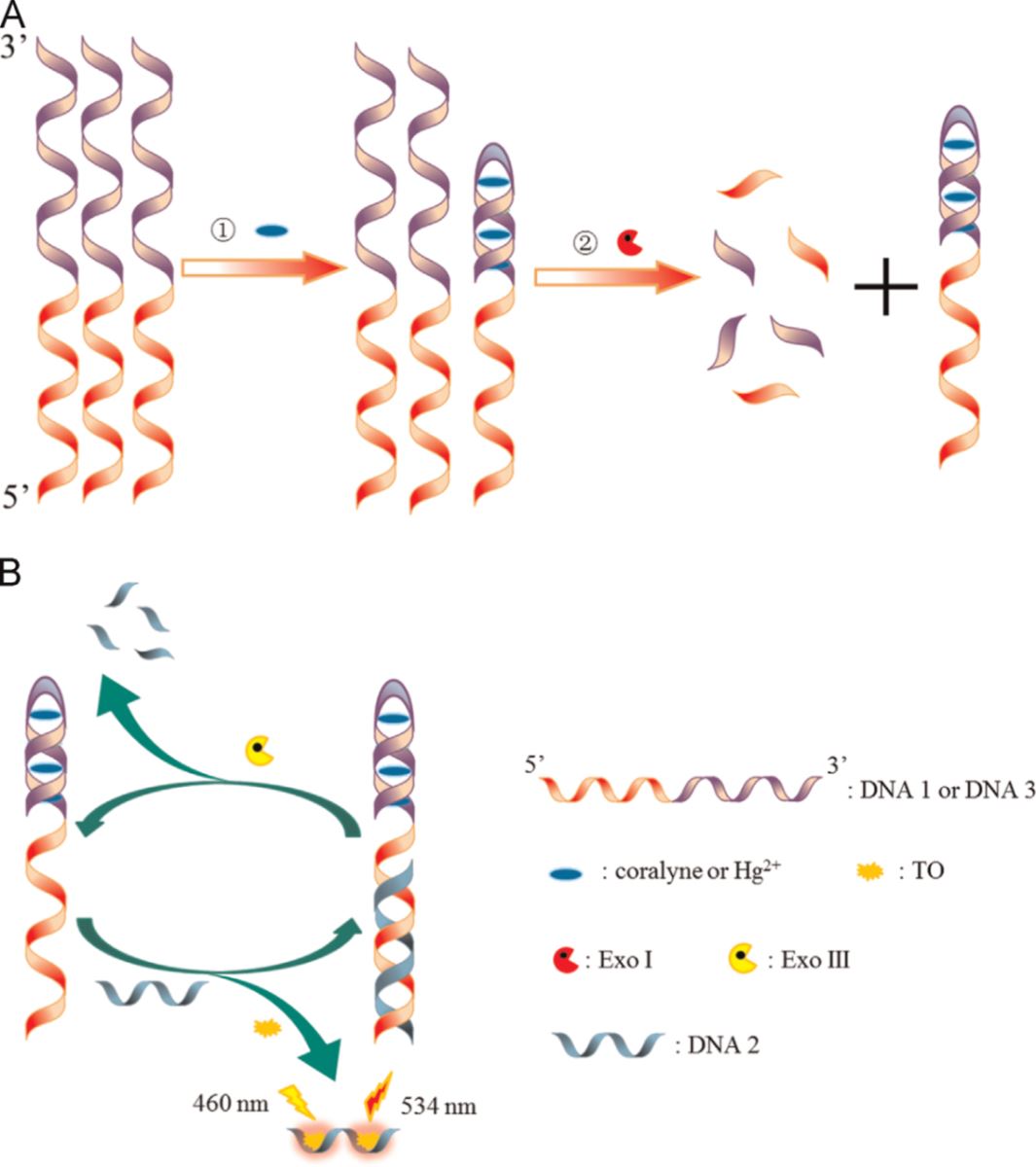 基于DNA构象的变化、适配体和金属配合物等,成功实现了系列生物分子:抗癌药物Coralyne ((Biosensors and Bioelectronics, 2015, 71, 439–444. (IF= 6.409));组氨酸 ((Biosensors and Bioelectronics, 2015, 66, 103-108.(IF= 6.409)),抗凝血分子Heparin ((Biosensors and Bioelectronics, 2014, 55, 174-179. (IF= 6.409))和Hg2+ ((Scientific Reports, 2014, 4, 5320. (IF = 5.578)) 的检测。
