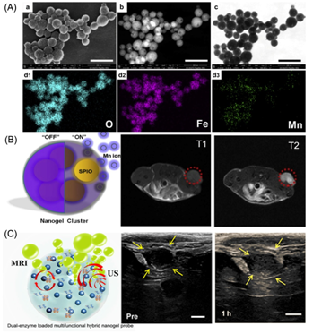 纳米凝胶,即纳米尺寸的凝胶,是高分子通过化学/物理交联形成的具有三维网络结构的纳米颗粒,广泛应用于在药物传输、生物成像应用中。有机-无机纳米杂化凝胶既有凝胶体系良好的生物相容性特点,又能结合无机纳米材料的功能性,越来越受到人们的关注。 最近,我系王启刚教授团队在多功能纳米凝胶基生物探针材料的设计、制备与应用研究领域取得重要进展,其最新研究成果“A Dual-Enzyme Loaded Multifunctional Hybrid Nanogel System for Pathological Responsive Ultrasound Imaging and T2-Weighted Magnetic Resonance Imaging”发表在国际知名期刊ACS Nano(DOI:10.1021/nn5068094 IF=12.0)上。该成果由化学系和基础科学高等研究院双聘助理研究员王霞博士作为第一作者完成,同时得到了1946伟德国际源自英国第十人民医院超声科徐辉雄教授的大力支持。 前期,王霞博士通过自组装和原位还原工艺在纳米凝胶中引入磁共振成像的无机功能组分(铁和锰)。该纳米凝胶基造影剂可实现肿瘤区域响应性增强的双模式成像,可以大大提高肿瘤成像的敏感度及小尺寸肿瘤病灶区的成像效率及安全性(Biomaterials, 2015, 53: 349-357, IF=8.3)。进一步研究中作者通过将超声成像功能分子活性氧响应双酶(超氧岐化酶和过氧化氢酶)和磁共振成像功能粒子(纳米四氧化三铁颗粒)同时引入到纳米凝胶体系中,实现肿瘤病变部位响应性刺激下(活性氧组分H2O2和O2•−)高效、安全的超声及磁共振双模式肿瘤成像诊断(ACS Nano, 2015, DOI: 10.1021/nn5068094)。
