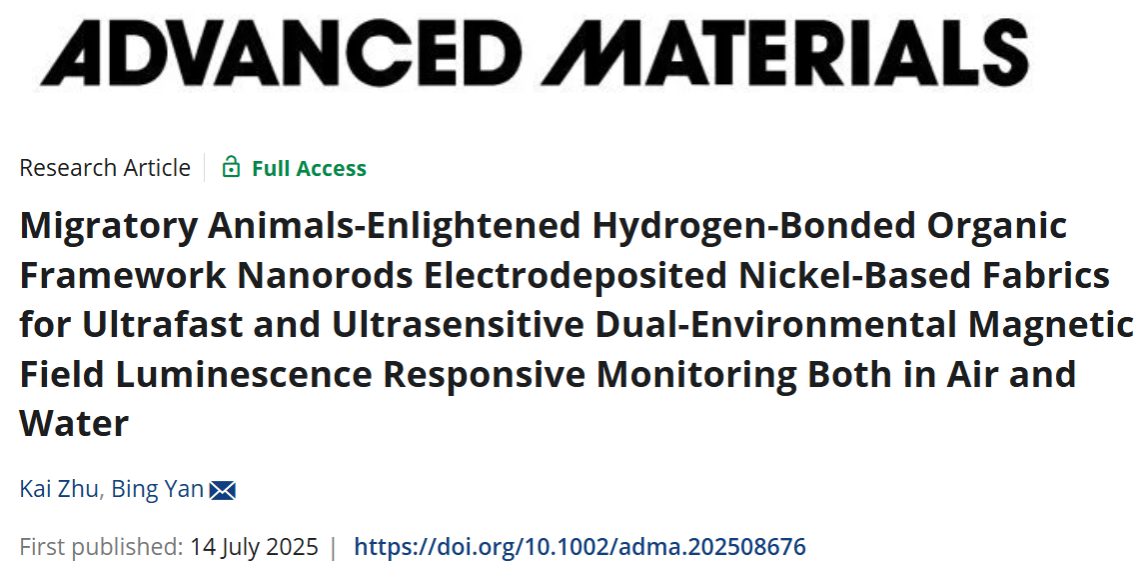 过去十年间,基于电学的磁传感器,如巨磁阻、隧道磁阻、各向异性磁阻、巨磁阻抗和霍尔效应传感器,已得到广泛报道。但其实际应用受到多种缺陷的限制,包括复杂的电路设计、寄生效应、信号串扰以及高制造成本。作为替代方案,基于发光传感机制的FBLMS代表了另一种有前途的方法,但此类研究鲜有报道。因此,开发低成本、双环境通用、极度灵敏且具备卓越的灵活性的FBLMS,仍面临重大挑战。鉴于此,迫切需要探索磁传感器的新概念和模型。基于HOFs的柔性复合薄膜被认为是卓越的选材对象。公司闫冰教授团队近期将迁徙动物磁导航能力巧妙地融合于HOFs基柔性器件之中,制备出超快及超灵敏的空气-水下双环境磁场传感器,并应用于水下磁无线通信、运动感知和空气-水下双环境磁智能实时监测,相关成果以“Migratory Animals-Enlightened Hydrogen-Bonded Organic Framework Nanorods Electrodeposited Nickel-Based Fabrics for Ultrafast and Ultrasensitive Dual-Environmental Magnetic Field Luminescence Responsive Monitoring Both in Air and Water”为题在线发表于化学、材料顶级期刊Advanced Materials上。