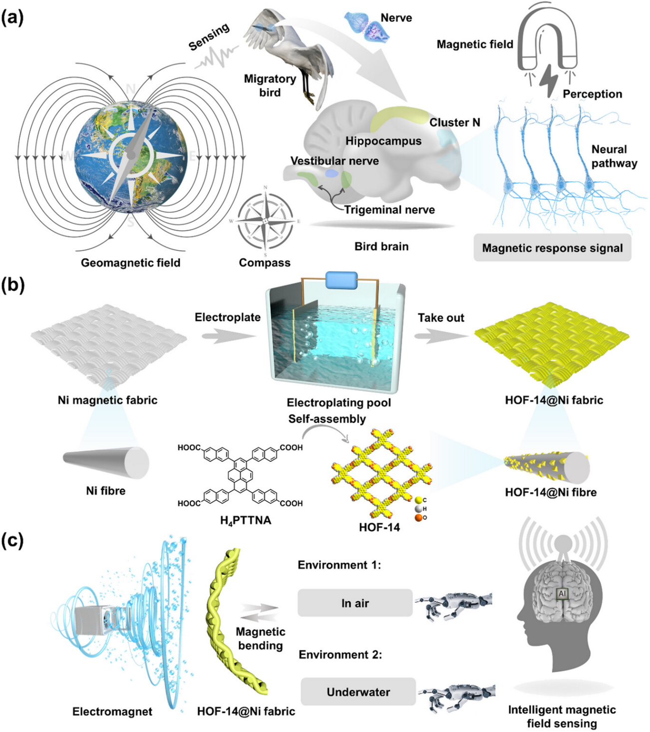 图注:a) 迁徙鸟类磁导航原理及处理磁信息的脑区。b) 基于电泳沉积法制备HOF-14@Ni织物磁传感器的工艺流程图。c) HOF-14@Ni织物空气-水下双环境智能磁场传感。