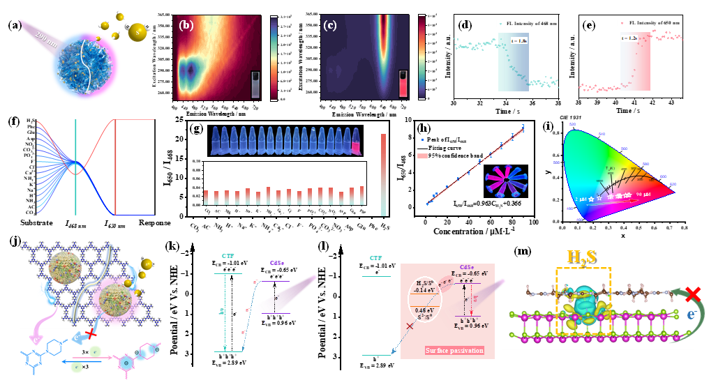 受中国传统灯笼结构的启发,设计并合成了一种以共价三嗪框架(CTF)为“灯笼壳”、CdSe量子点为“发光芯”的球形复合结构。该结构在纳米尺度下实现了异质结构筑,使电子丰富的CdSe量子点与电子缺陷的CTF之间形成了稳定而高效的界面耦合关系。通过密度泛函理论计算和实验验证,揭示了该异质界面在氧化还原刺激下产生重构,进而驱动激子态的调节,首次建立起“界面重构-激子调控-荧光响应”三者之间的耦合机制。