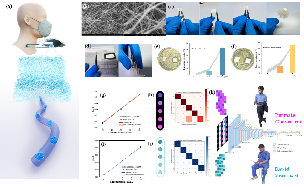 不仅如此,该CdSe@CTF材料在保持出色荧光响应的同时,还表现出类似天然氧化酶的催化行为,可通过氧化TMB显色反应形成比色响应,实现了单一体系内荧光-比色的双模协同检测。进一步地,研究团队将该材料制备为柔性电纺膜,结合人工神经网络(ANN)图像识别系统,构建出一套兼具环境适应性与智能判别能力的可穿戴视觉传感器,能够在生物相关条件下稳定识别H₂S气体,展现出良好的应用潜力。