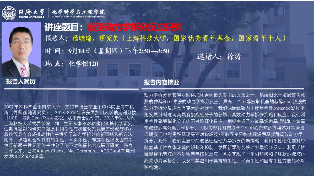 (9月14日)杨晓瑜研究员:新型动力学拆分反应研究