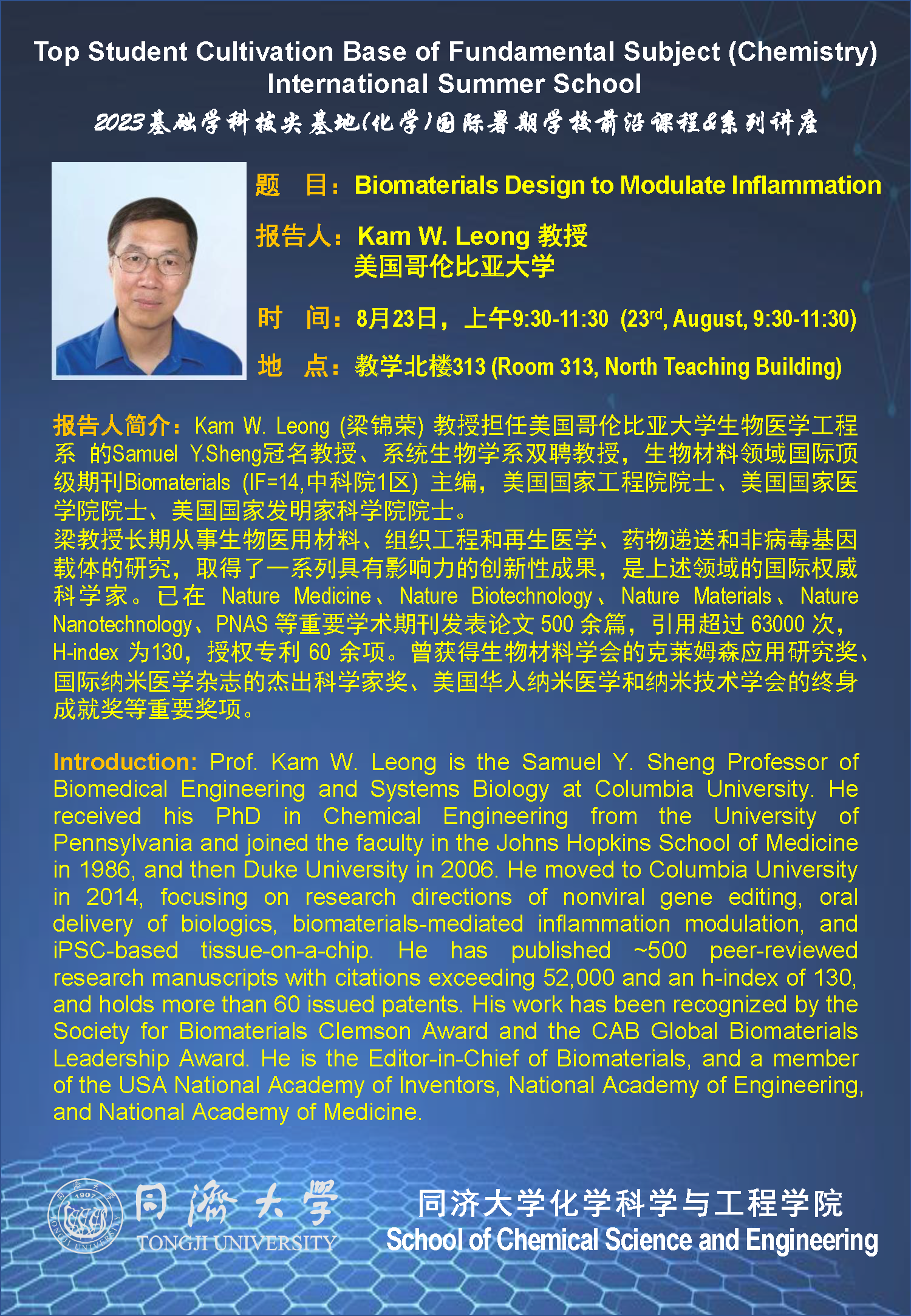 (8月23日)Prof. Kam W. Leong:Biomaterials Design to Modulate Inflammation