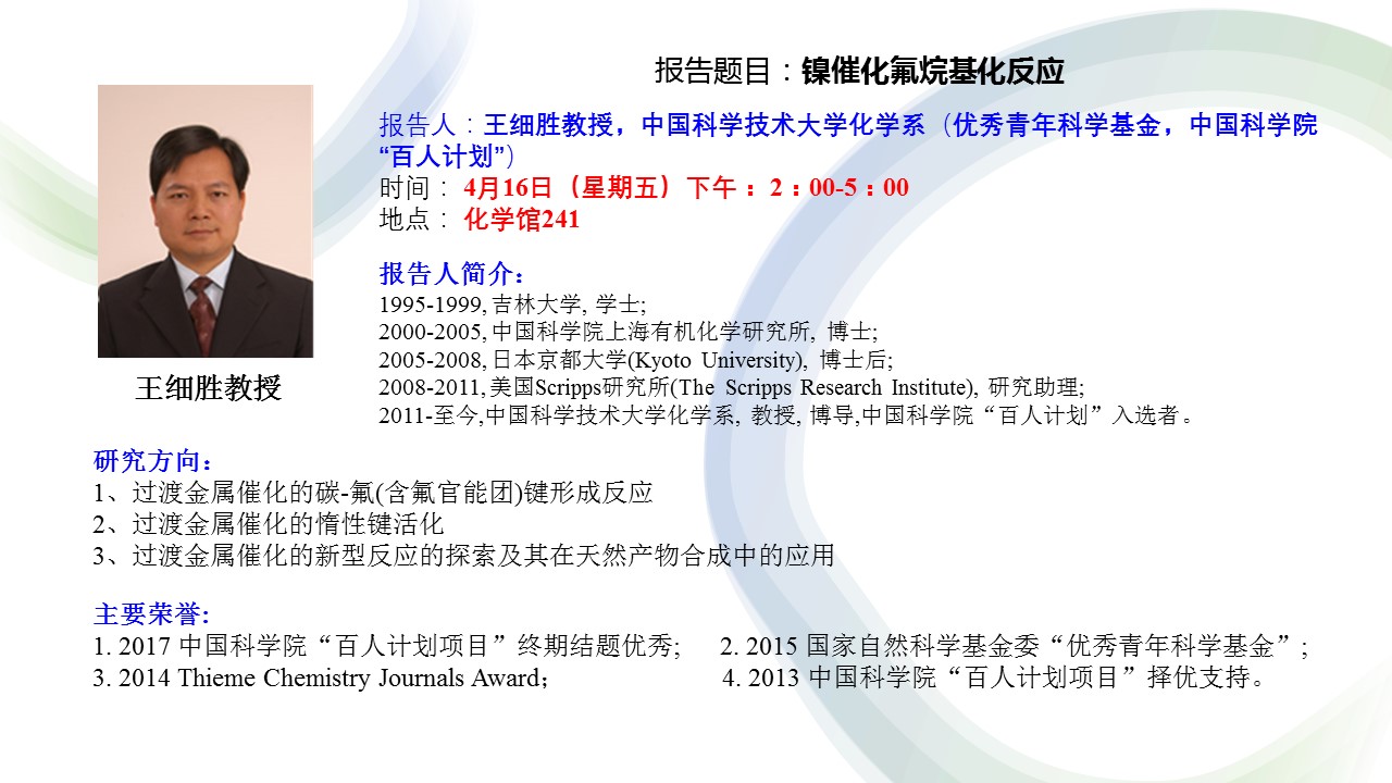 学术报告 ,4月16日 2:00-5:00 镍催化氟烷基化反应