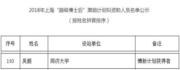 公司博士后吴超入选2018年上海“超级博士后”激励计划