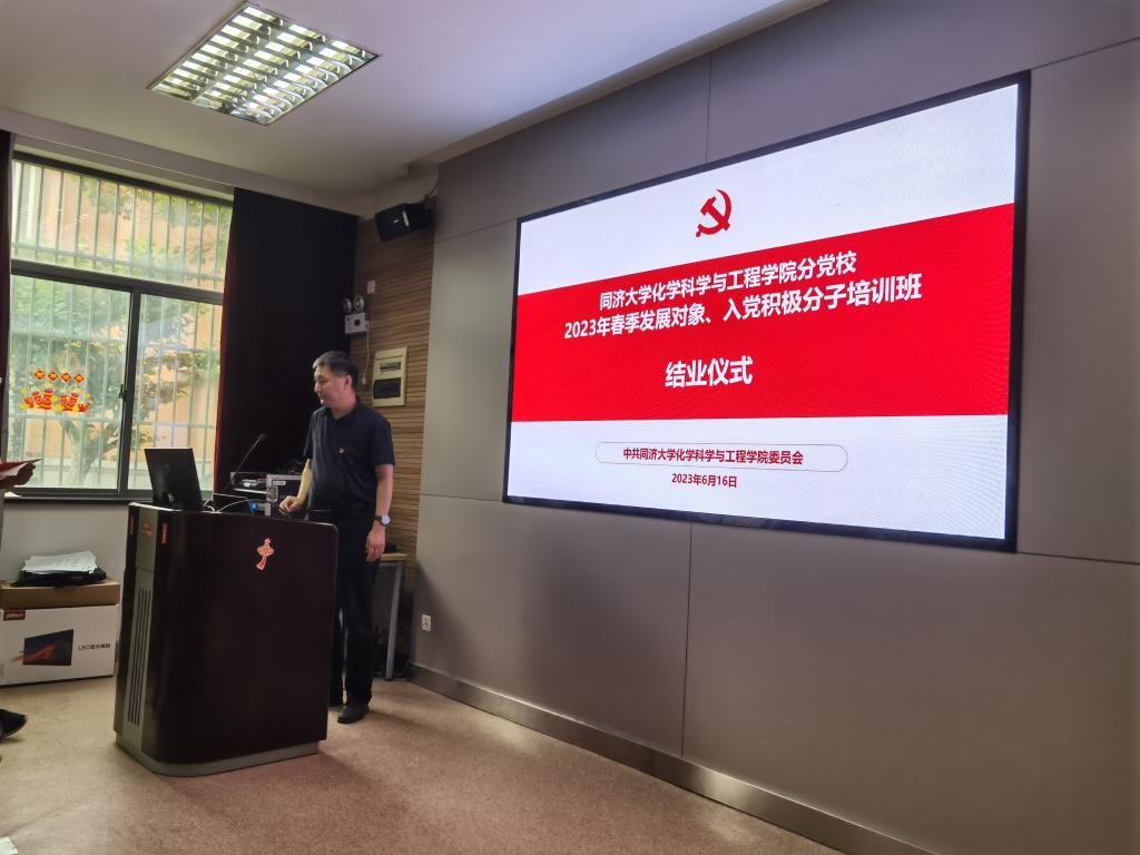 结业仪式后,母朝静给学员们讲授了主题党课。首先,母朝静分享了主题教育理论学习、调查研究等开展情况体会,并从学习习近平总书记给中国农业大学科技小院的同学们回信精神引申开来,希望同学们能够“自找苦吃”,更要吃得苦,做大事。然后,他与学员们共同学习了新时代同济文化的阐释、传承与弘扬。最后,他以《同济化学发展的历史、现状与未来》为题对公司学科文化进行了阐释解读。
