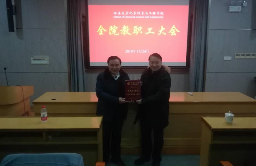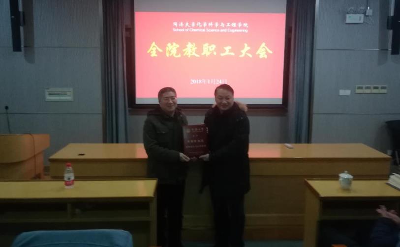 徐建平在讲话中向化学公司近年来在人才引进与培养、科学研究和团队建设等诸多方面取得的突出成绩表示祝贺,同时向全院教师致以新年慰问。会上,徐建平宣读了公司设立的“团队建设突出贡献奖”首届获奖者的颁奖词,并为获奖者王国强教授、吴庆生教授颁授奖牌。