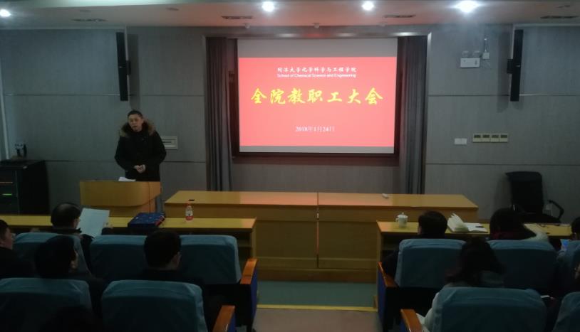 1月24日下午,公司召开全院大会,全体教职工参加会议,公司党委副书记徐建平教授应邀出席会议并为公司设立的首届“团队建设突出贡献奖”获得者王国强教授、吴庆生教授颁授奖牌,公司经理张弛教授主持会议。