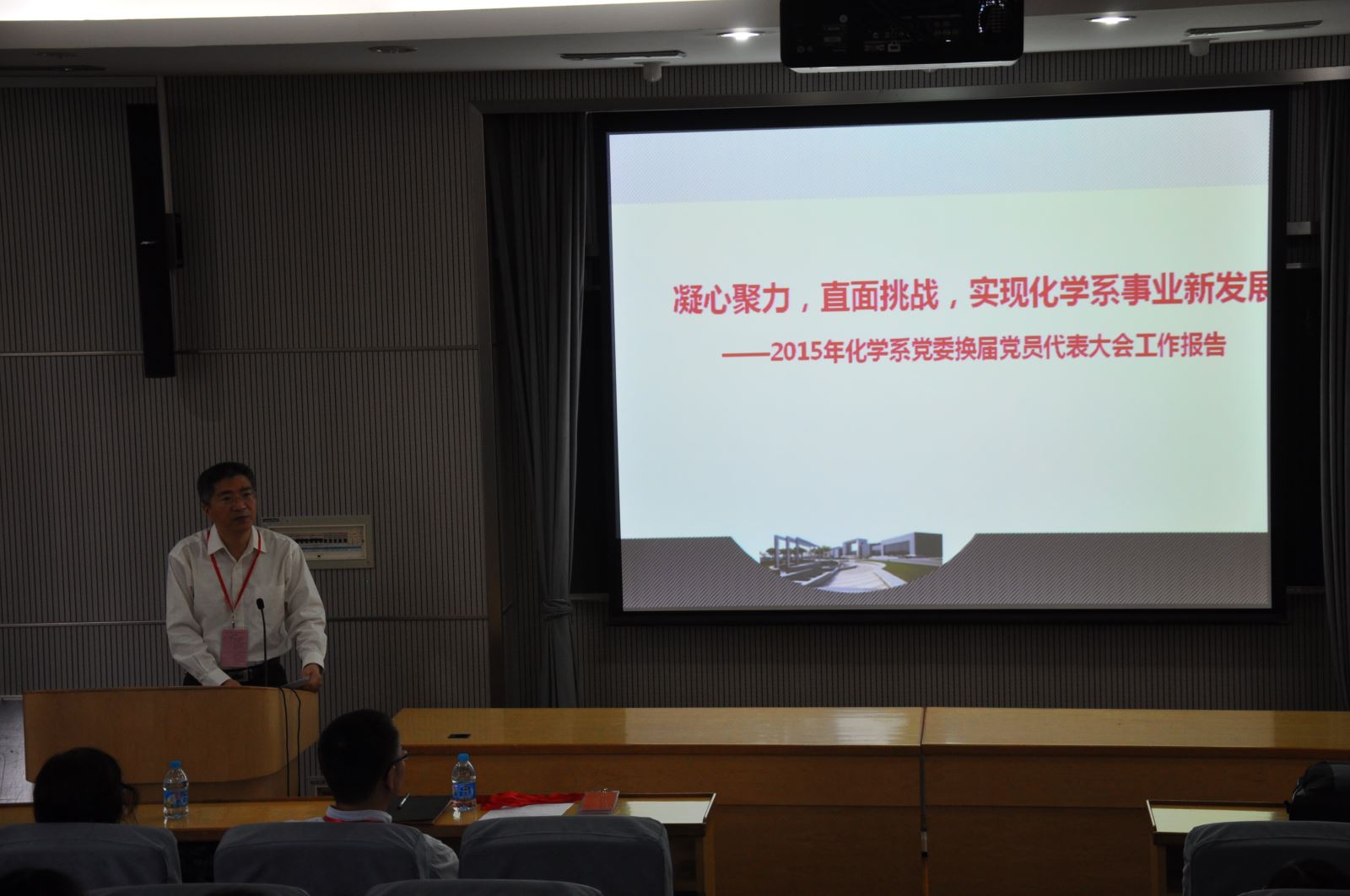 系党委书记王国强同志代表上届中共1946伟德国际源自英国化学系委员会向大会作题为《凝心聚力、直面挑战,实现化学系事业新发展》的工作报告。报告客观地回顾了上届系党委(党总支)过去五年的工作:一是加强党的建设,引领和谐、可持续发展,分别从切实加强组织建设、认真组织学习活动、重视党风廉政建设、重视民主管理等方面介绍了过去五年的党建情况。二是加强内涵建设,推动事业发展,就加强团队队伍建设、加强团队建设、提高办学层次、重视本科教学提高教学质量和国际化办学特色逐步加强几个方面分别概述。三是重视宣传思想工作,加强全员育人工作,指出化学系过去五年注重员工工作实效,不断强化团学活动特色,逐渐提升宣传工作水平,营造了良好的全员育人氛围。