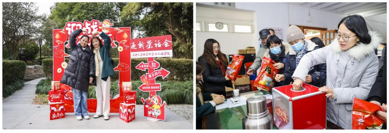 茶话会伊始,到场的教职工在入口处进行了创意十足的“打卡”仪式。在精心设计的背景板前留影,记录下这一重要时刻,为茶话会增添了一份温馨与期待。为了增加活动的趣味性和互动性,教职工们在进入会场时参与了抽签入座环节。每位老师随机抽取带有化学元素的座位号,这不仅让新老教职工有了更多交流的机会,也让现场气氛更加轻松愉快。