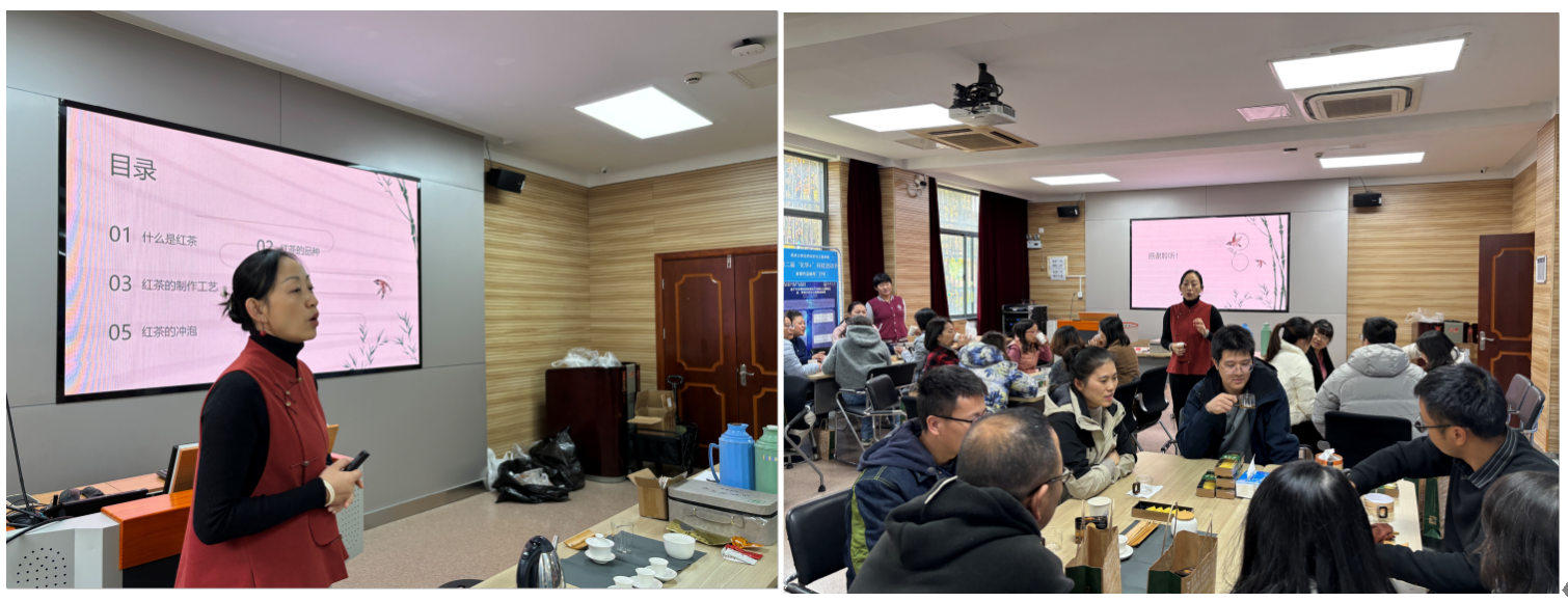 “冬季红茶的品鉴与冲泡技巧”交流活动:特别邀请国家一级茶艺师、两宋点茶研习协会发起人冉玲老师为教职工们进行有关红茶的专题讲座以及现场品鉴互动交流。冉老师通过详细介绍红茶的种类、特点、发源地、制作工艺和鉴别等五个部分,向老师们传授了中国的红茶文化,并通过亲自示范不同类红茶的冲泡技巧,教老师们学习办公室的基础冲泡方法。之后大家在冉老师的指导下,分组现场进行红茶冲泡,互相品鉴红茶的香气和口感,感受茶文化的特色和韵味。