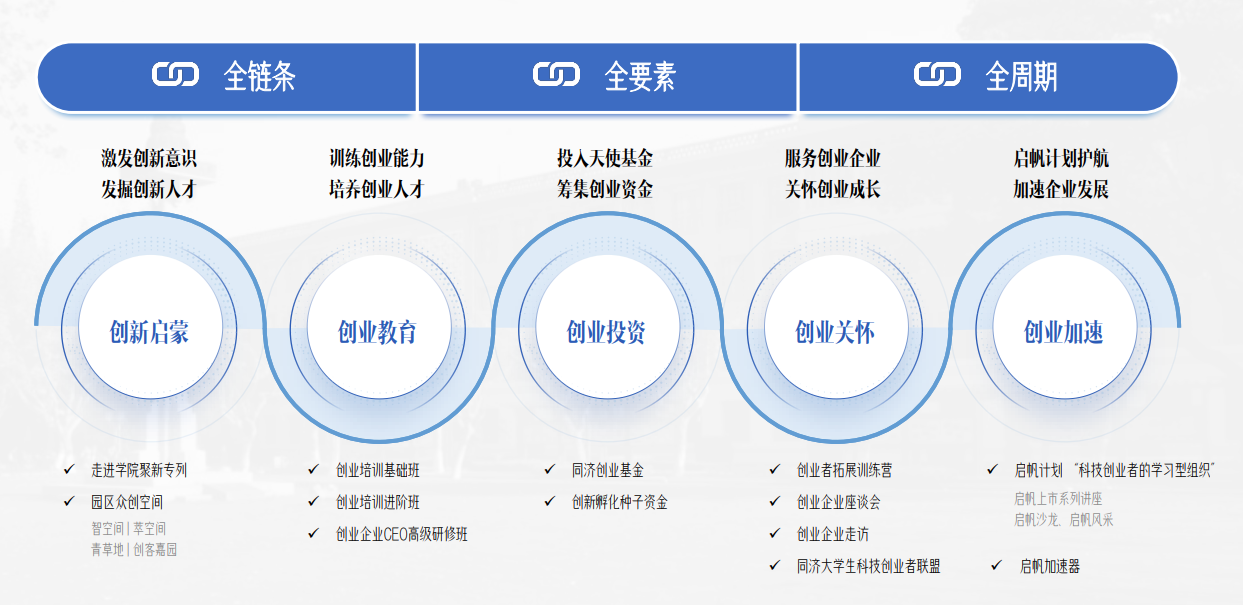 经过十余年的实践和积淀,同济创业基金建立了针对老员工创业的全链条全要素全周期服务体系,涵盖“创新启蒙、创业教育、创业投资、创业关怀、创业加速”五个环节,孵化培育出同臣环保、济辰节能、同化新材料、伊尔庚环境、同科生物、同毅自动化、微谱化工、华励振环保、联泉科技、耘申信息、枢源节能、同星智能、悦充网络、海顾新材料、吾励环境、万狮环保、同陆云、兆边科技、塔拉海洋、优积科技、济联科技等一大批优秀老员工创业企业,广泛分布在节能环保、新材料、智慧城市、生物医药、信息技术、现代服务业等领域。