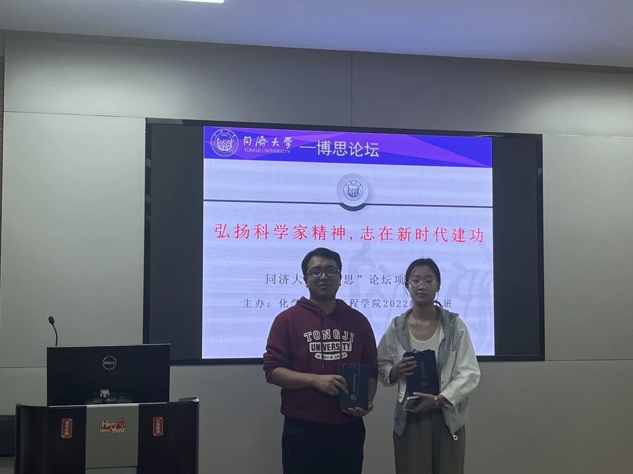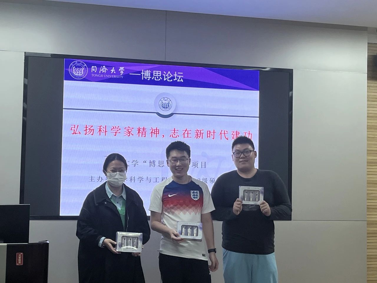 活动最后为获奖同学颁发奖品,本次知识竞赛共两名同学荣获一等奖,三名同学荣获二等奖,五名同学荣获三等奖,获奖同学上台领奖并合影留念。2023年3月5日,习近平总书记在参加十四届全国人大一次会议江苏代表团审议时强调:“加快实现高水平科技自立自强,是推动高质量发展的必由之路。”在科研生涯的起点——研究生阶段,借助“博思论坛”这一科研交流平台为同学们树立正确榜样,培养科学家精神,有助于帮助同学们在科研工作的初期树立正确的人生观、价值观、世界观,坚定同学们在科研工作中勇于进取创新、敢于突破进取新领域的勇气,以实际行动为中华民族伟大复兴事业贡献科研力量。