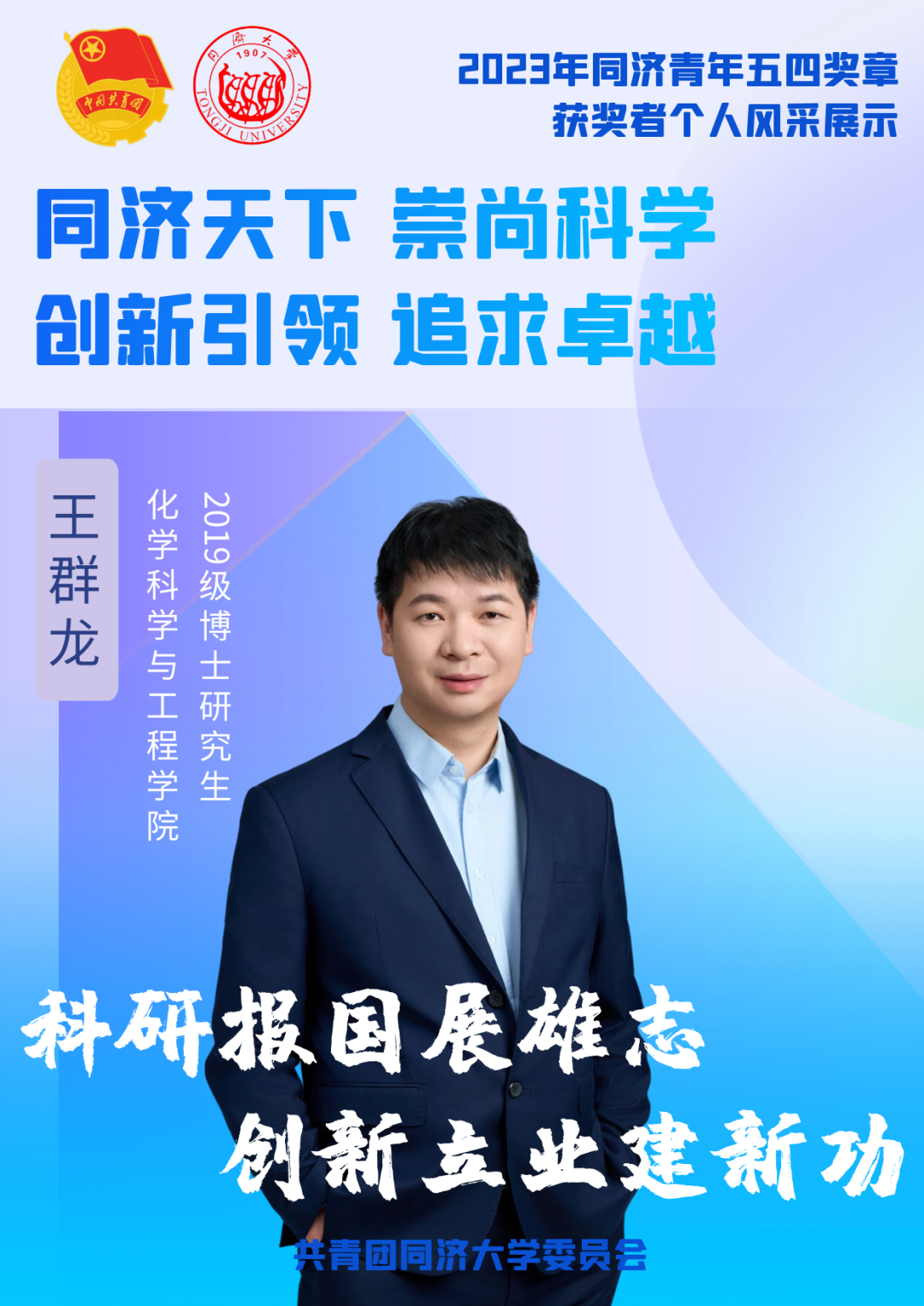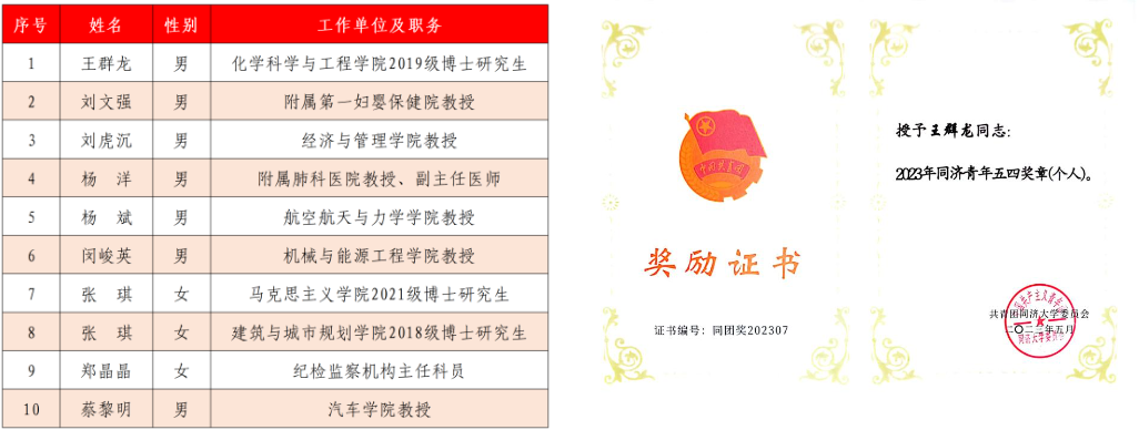 根据《关于开展2023年同济青年五四奖章评选的通知》的要求,在各单位推荐、评审委员会评审的基础上,2023年同济青年五四奖章(个人)获奖者及(集体)获奖单位名单公布。公司2019级博士研究生王群龙获评2023年同济青年五四奖章(个人)。5月4日,王群龙获颁2023年同济青年五四奖章证书。