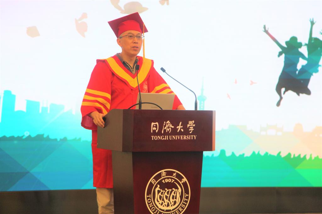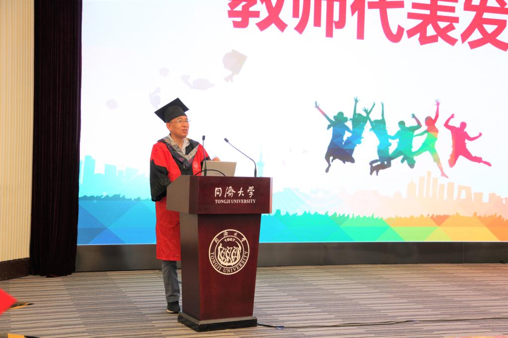 教师代表、上海市重点实验室主任王雪峰教授为毕业生寄语,代表公司老师们表达了对同学们的眷恋之情,提出了希望和祝愿。他提到,“母校心中会铭记着你们的青春风采,母校为你们奠定了赢得人生的基石,也给了你们价值观”,“踏出校门后走向社会,同学们将迎来无比多的机会和挑战”,“期望你们敢于创新,坚韧执着,不断追求卓越”。同时,他还嘱托到—千万不要“躺平”,“躺平”意味着“熵”无限增大,最终也会以最快的速度耗尽生命。在场的师生纷纷动容,眼里闪着泪光。