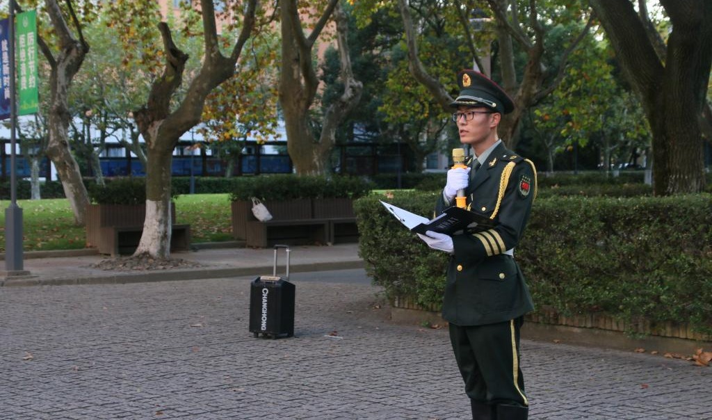 主持人王正明宣布升旗仪式正式开始,国旗护卫队的队员们迈着整齐划一的步伐,护送国旗入场,伴着嘹亮的国歌声,五星红旗冉冉升起、迎着清晨的风飘扬,全体师生怀揣着对祖国的热爱,向国旗行注目礼,脸上难掩内心的自豪感和崇敬之情。
