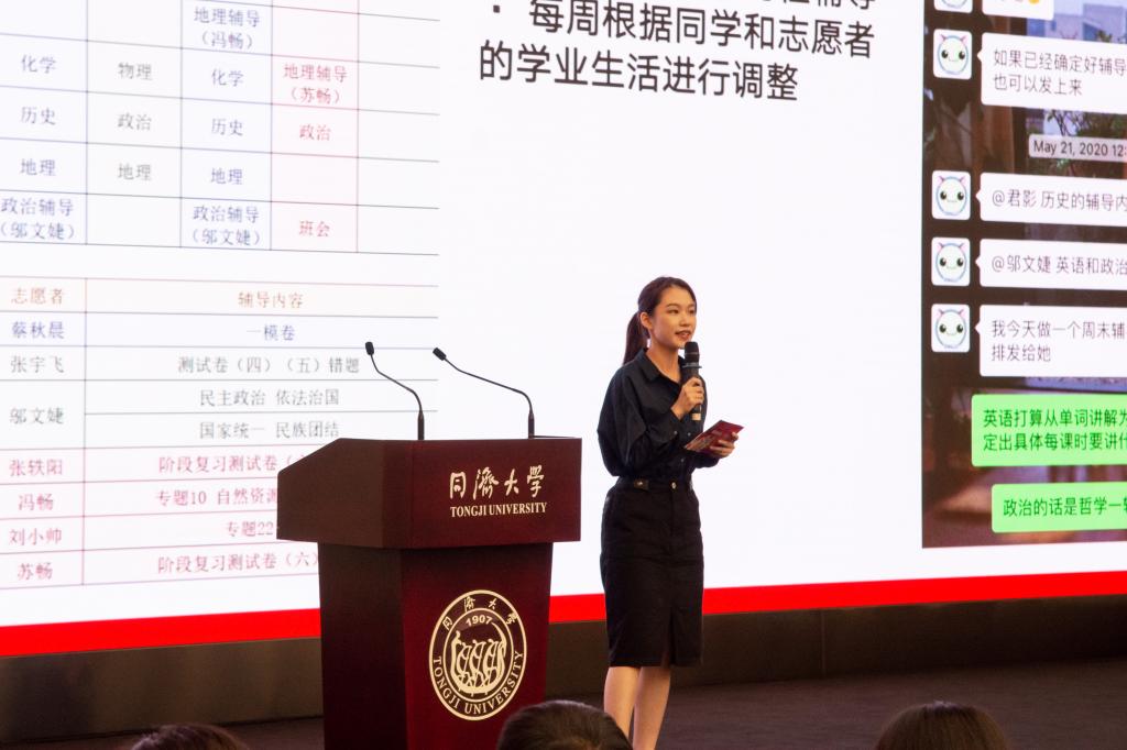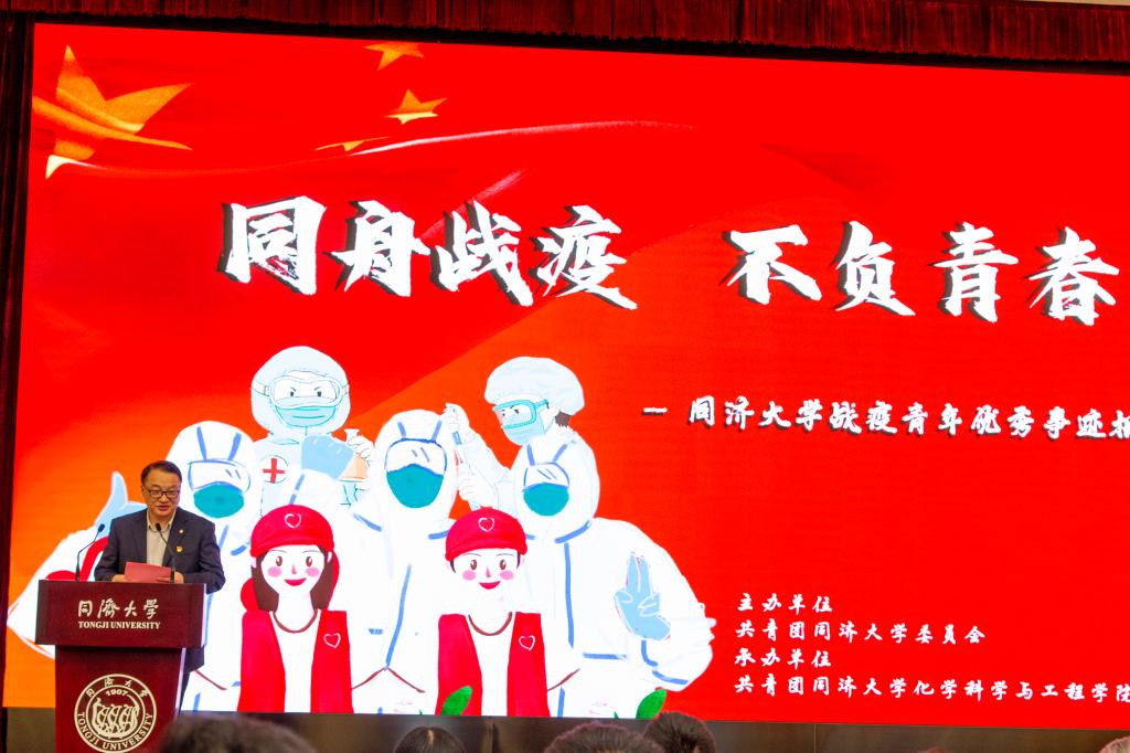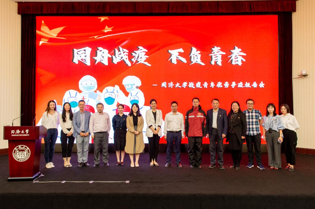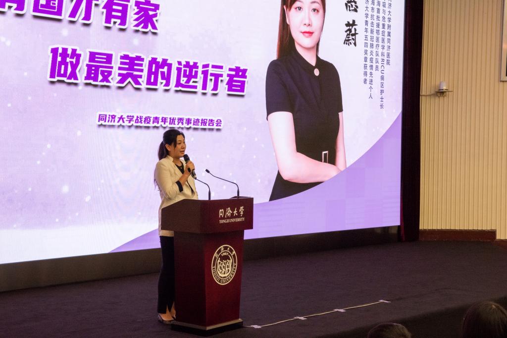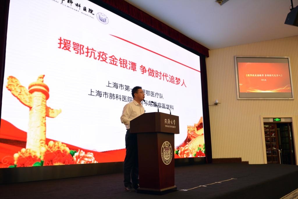 附属上海市肺科医院呼吸与危重症医学科带组主任、副主任医师、上海首批援鄂医疗队定向援武汉金银潭医院北三病区(ICU)第三组副组长程克斌,附属同济医院呼吸与危重症医学科RICU病区护士长、上海首批援鄂医疗队定向援武汉金银潭医院北三病区护理组小组长惠蔚,附属东方医院主管药师、援武汉客厅方舱医院主管药师黄国鑫,医公司左为教授团队研究助理王宇嘉,2016级建筑与城市规划公司本科生、“同济逆行者”后端保障突击队成员代表邬文婕分别以“援鄂抗疫金银潭,争做时代追梦人”“有国才有家,做最美的逆行者”“武汉客厅的方舱记忆”“科研助力战‘疫’,医公司学子争分夺秒科研攻关”“以温情抗‘瘟情’,同济青年在路上”为主题,分享了他们在一线战“疫”中的所见所闻所感,讲述了他们与家人、同事、患者、志愿者相互支持、共克时艰的感人故事。