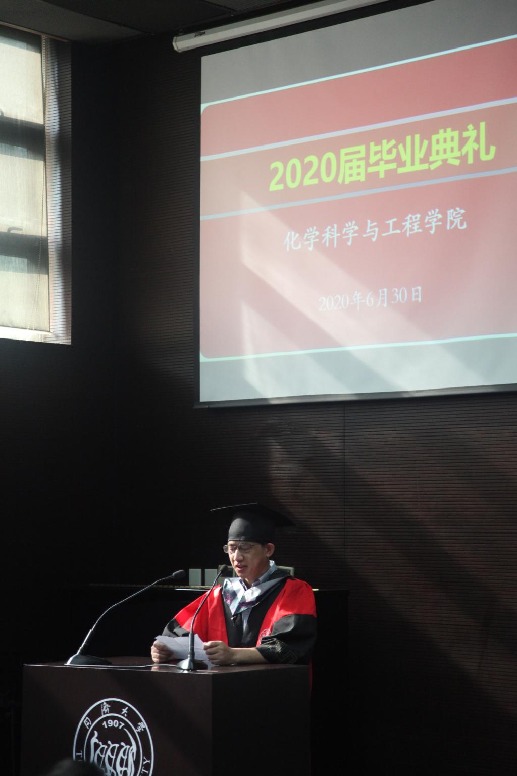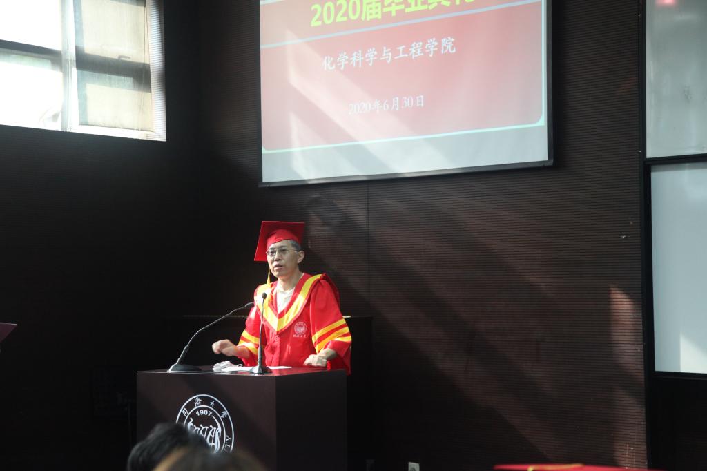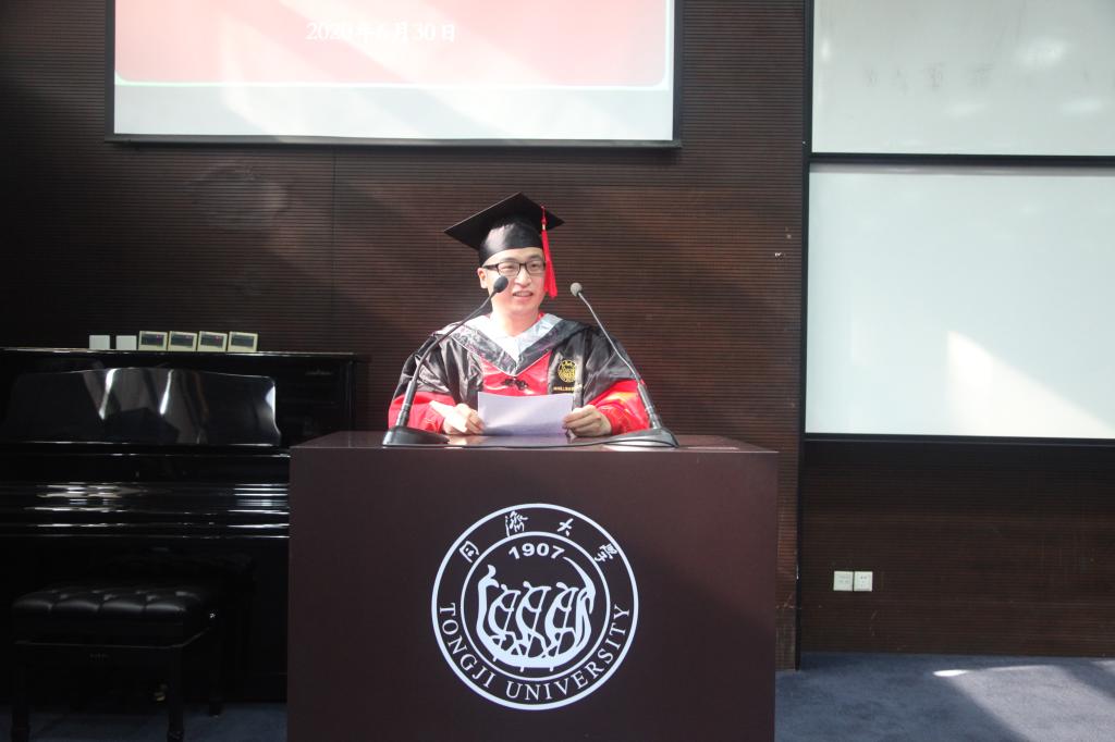 魏俊杰同学代表全体毕业研究生发言。他分享了自己在同济、在同济化学学习生活九年的所思所想。他说,感谢母校和公司的培养,为我的学习成长搭建起追求卓越的阶梯;感谢所有公司老师在学业和生活上的关心与帮助,使我原本荆棘丛生的道路变得光明而平坦;感谢所有同学与好友的陪伴与鼓励,让我有勇气能自信地面对各种困难与挑战;还要特别感谢化学这一学科,是它教会了我知行合一、上下求索的科学真谛。