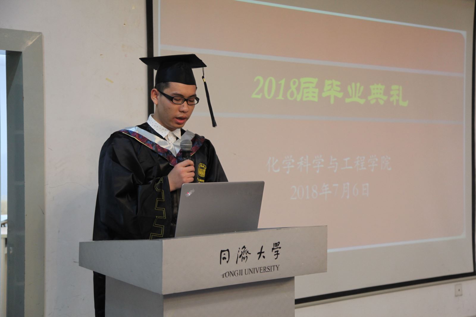 高如如同学代表全体毕业研究生发言,她说,在化学公司学习的九年时光,让她不断成长,并且见证了公司蜕变:从公司的成立,到学科排名的持续攀升,再到越来越多的科研突破,都让她十分自豪。毕业生们将永远珍藏这段意义非凡的回忆,带着化学人的骄傲,秉承匠心,砥砺前行。郑浩洋代表全体本科毕业生发表毕业感言,感谢同济和化学公司的辛勤培育,感谢老师传授知识、指明人生方向,感谢同窗好友的鼓励与陪伴,感谢父母的支持与默默付出。