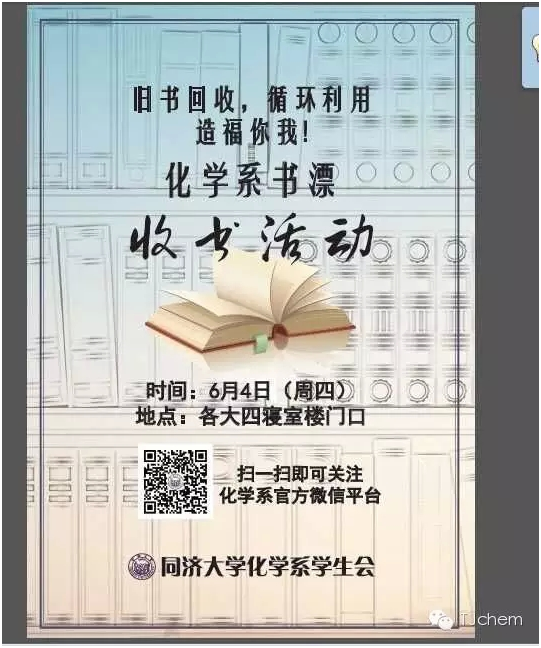 此活动由化学系员工会主办,旨在回收高年级同学的教材和其他书籍,在每学年开学之际免费将相关书籍转赠给低年级同学,让书籍循环使用,为资源回收利用贡献一份力量。
