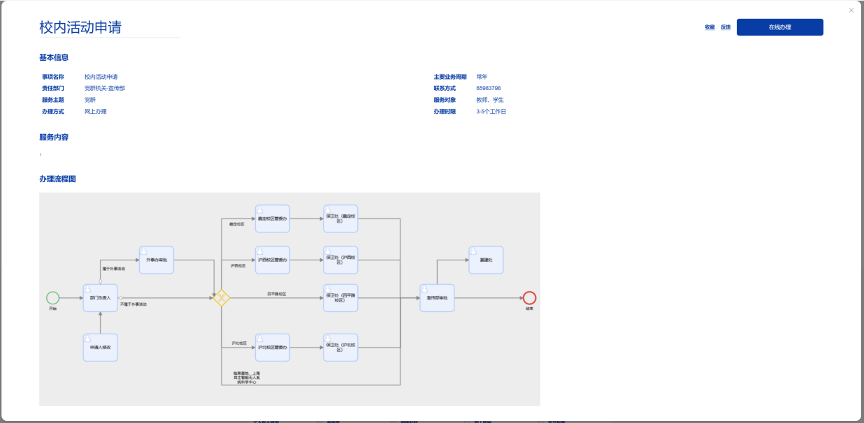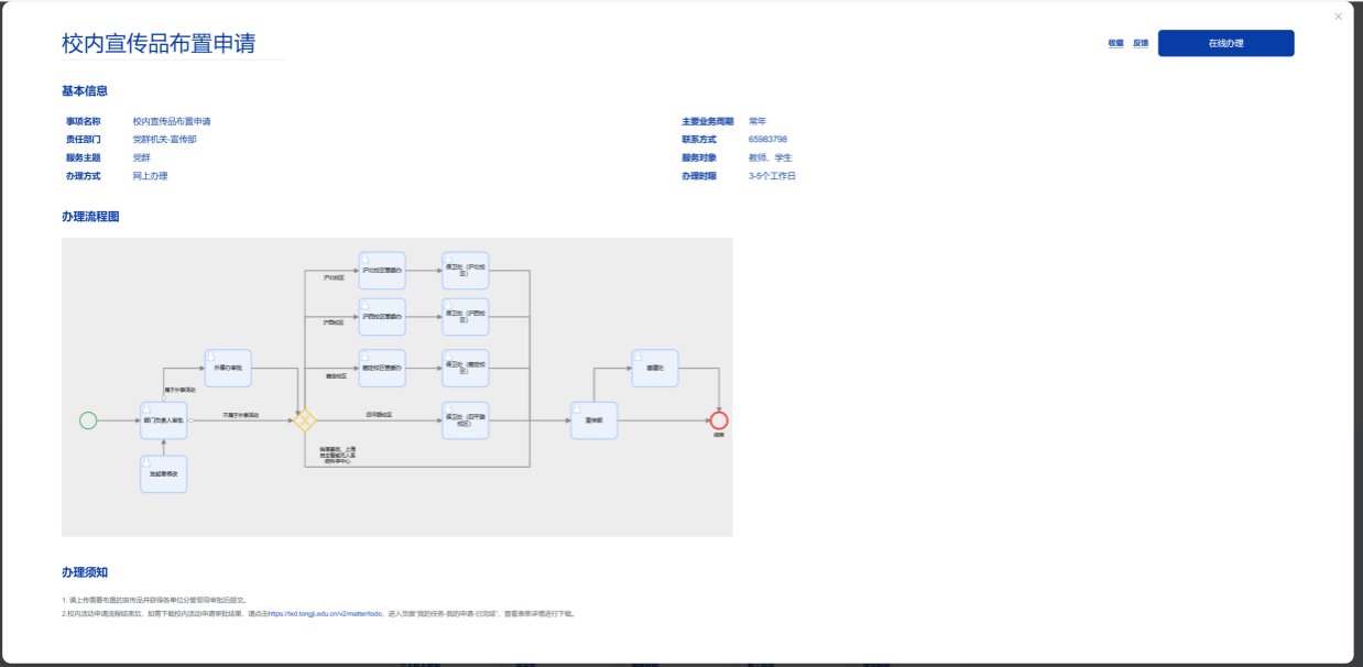 如仅需布置宣传品不涉及到活动申请,可直接在一网通中搜索“校内宣传品布置申请”,点击“在线办理”。请按照实际摆放位置进行申请,并上传宣传品最终版进行审核。如需申请校内固定宣传展位的,目前嘉定校区D区(中央大道部分及三角地区域)、嘉定校区E区(仰望星空下)和沪西校区F区(南门口路东侧)可供预约。